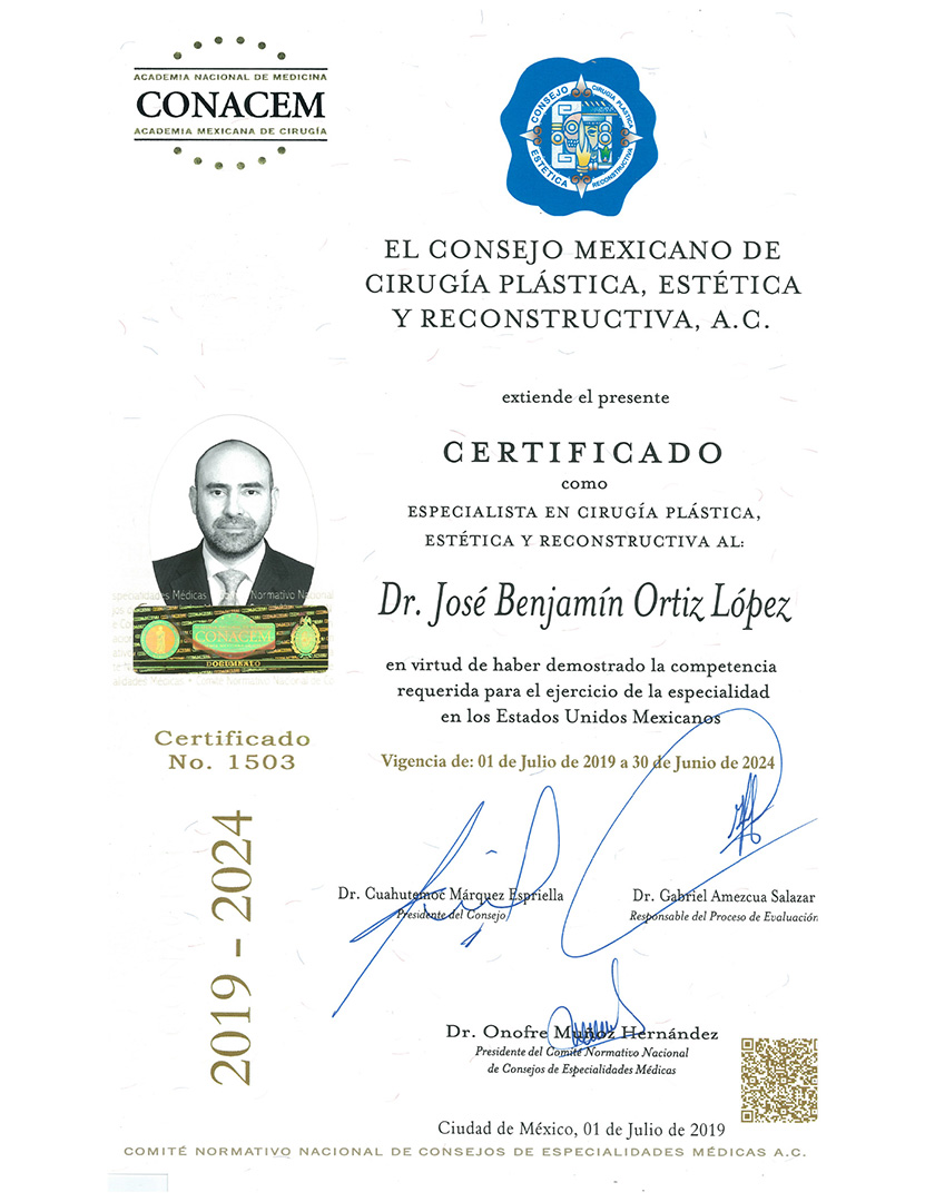 - RECERTIFICACION VIGENTE por el Consejo Mexicano de Cirugía Plástica, Estética y Reconstructiva (C.M.C.P.E.R.), Ciudad de México. 2024-2029.
